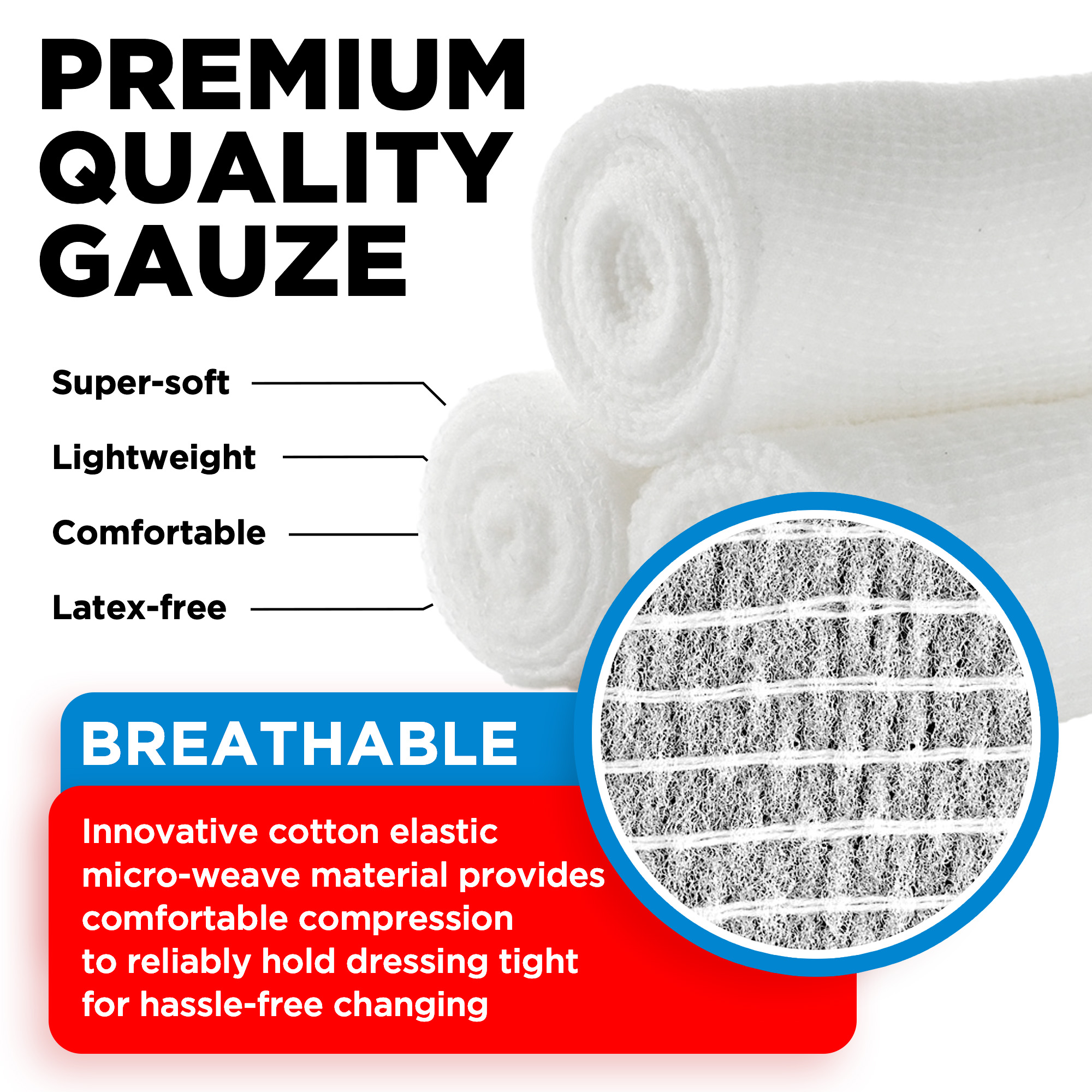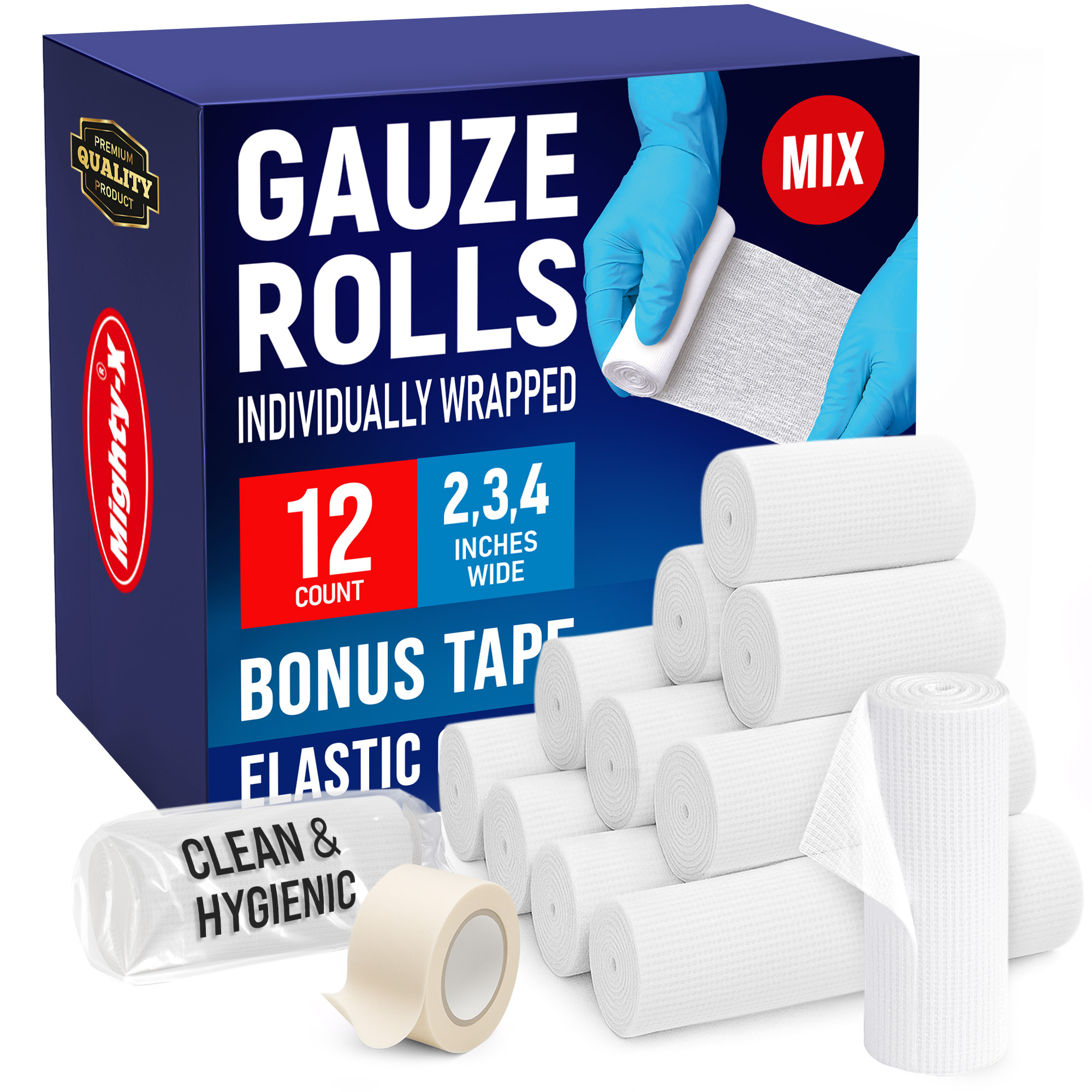 The high-quality micro-weave gauze roll makes bandaging much easier compared to regular gauze. You can change bandages easily on your own to keep sores clean and hygienic. Mighty-X’s white gauze will not leave lint or stray fabric strands behind, making the healing process hassle-free. Each 4.1-yard long gauze bandage roll from this 12-roll value pack comes individually wrapped to keep it debris-free until you are ready to use it. Your purchase also includes a roll of medical tape to affix the loose end to keep your dressing snug.