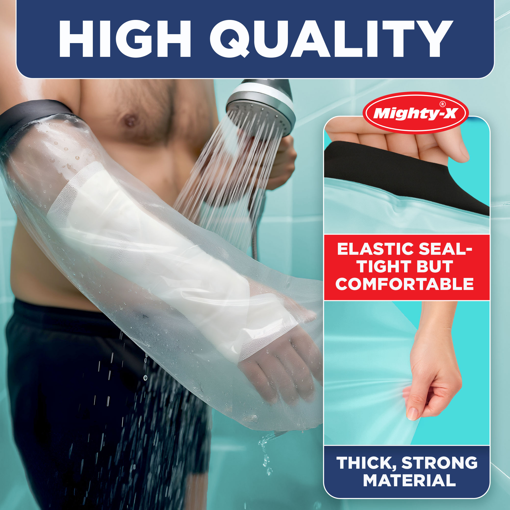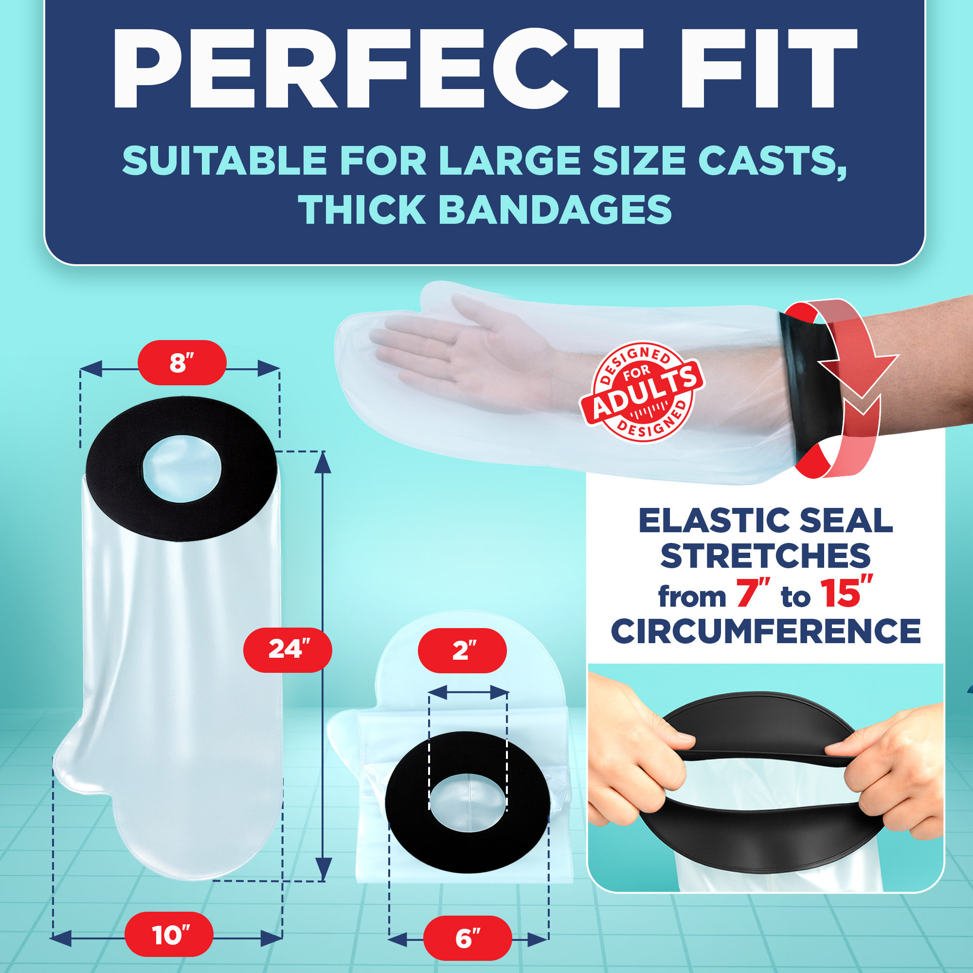 Mighty-X cast waterproof cover leg shields come in a pack of two, so you will always have a backup when needed. The cast bag for shower leg injuries retains its elasticity for many showers if used carefully. As proven by thousands of satisfied clients, one pack of safety covers may last for the duration of your healing process. Please note that our cast protector for shower leg adult sized sleeve measures 39” x 12”—large enough to fit most adult legs. Try Mighty-X leg cast covers for shower adult fractures and take a shower whenever you want!