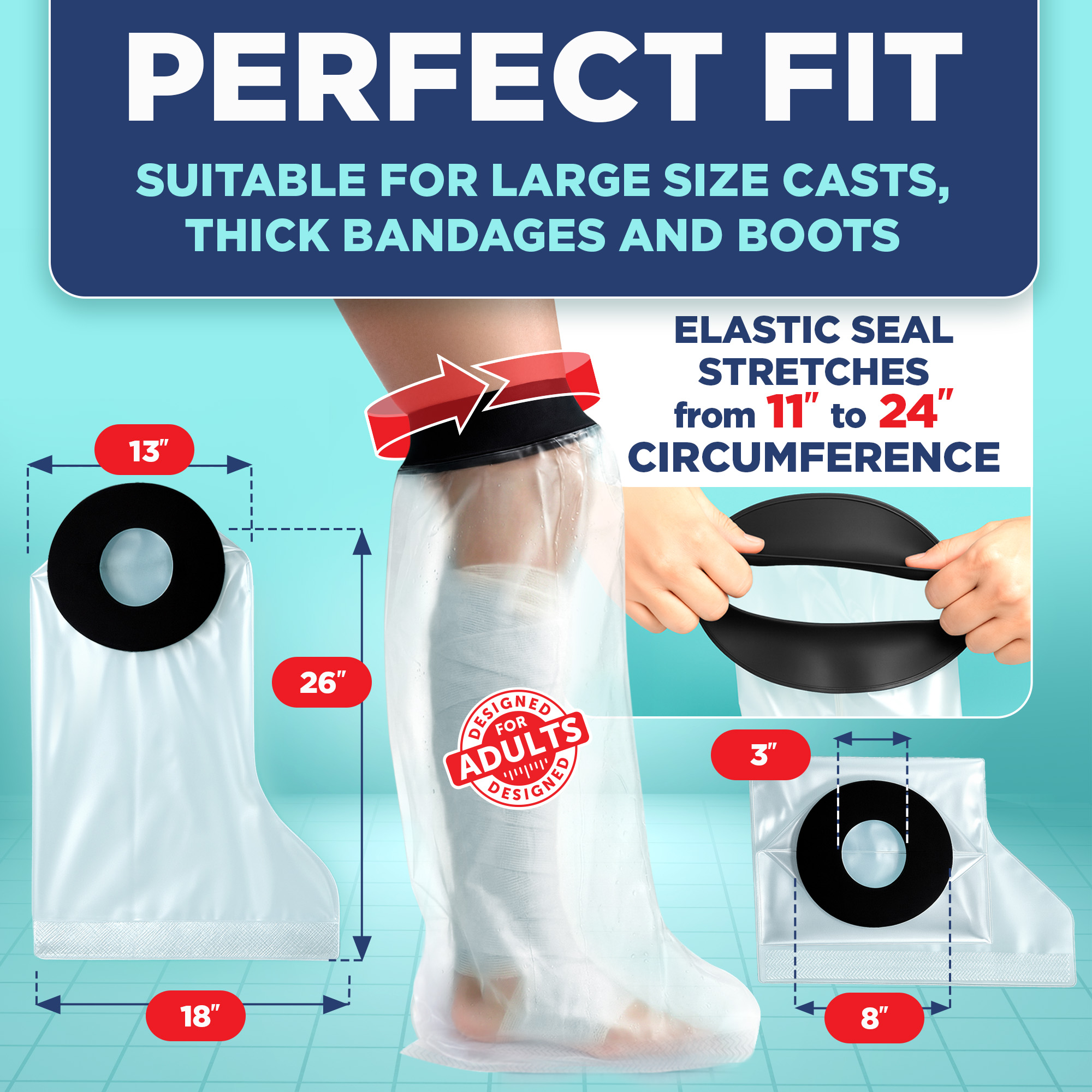 Mighty-X cast waterproof cover leg shields come in a pack of two, so you will always have a backup when needed. The cast bag for shower leg injuries retains its elasticity for many showers if used carefully. As proven by thousands of satisfied clients, one pack of safety covers may last for the duration of your healing process. Please note that our cast protector for shower leg adult sized sleeve measures 39” x 12”—large enough to fit most adult legs. Try Mighty-X leg cast covers for shower adult fractures and take a shower whenever you want!