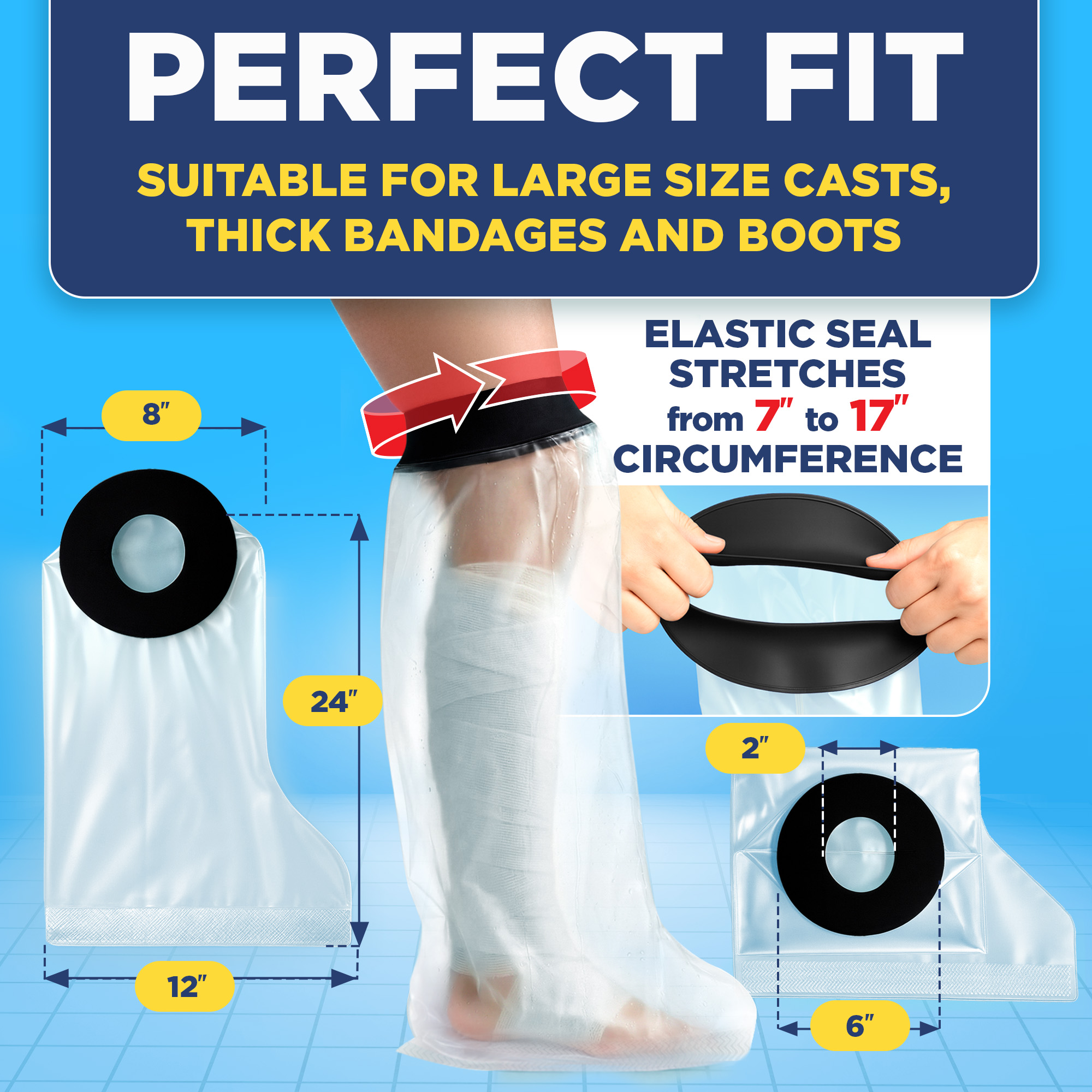 Mighty-X cast waterproof cover leg shields come in a pack of two, so you will always have a backup when needed. The cast bag for shower leg injuries retains its elasticity for many showers if used carefully. As proven by thousands of satisfied clients, one pack of safety covers may last for the duration of your healing process. Please note that our cast protector for shower leg adult sized sleeve measures 39” x 12”—large enough to fit most adult legs. Try Mighty-X leg cast covers for shower adult fractures and take a shower whenever you want!